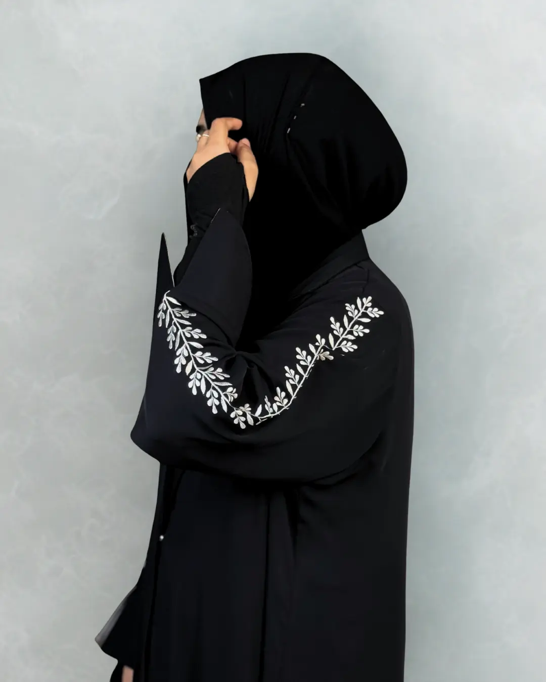 The sleeves are delicately embroidered in white, adding a subtle touch of luxury. A matching black nida scarf is included to complete the look, making it perfect for both everyday wear and formal occasions.