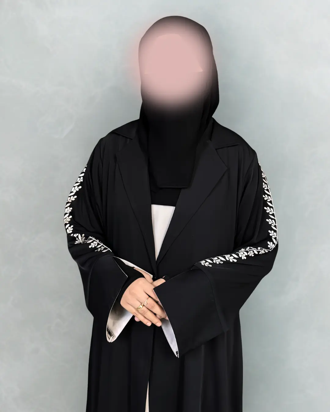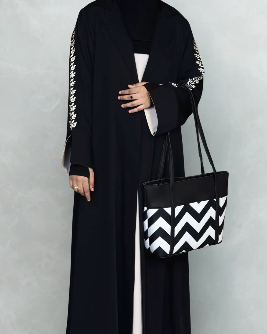 This elegant coat collar abaya is designed for a refined and modern modest look. The outer layer is made from premium black nida fabric, offering a smooth flow and graceful fall. The sleeveless inner is crafted from soft white georgette, providing a beautiful contrast and comfortable wear.