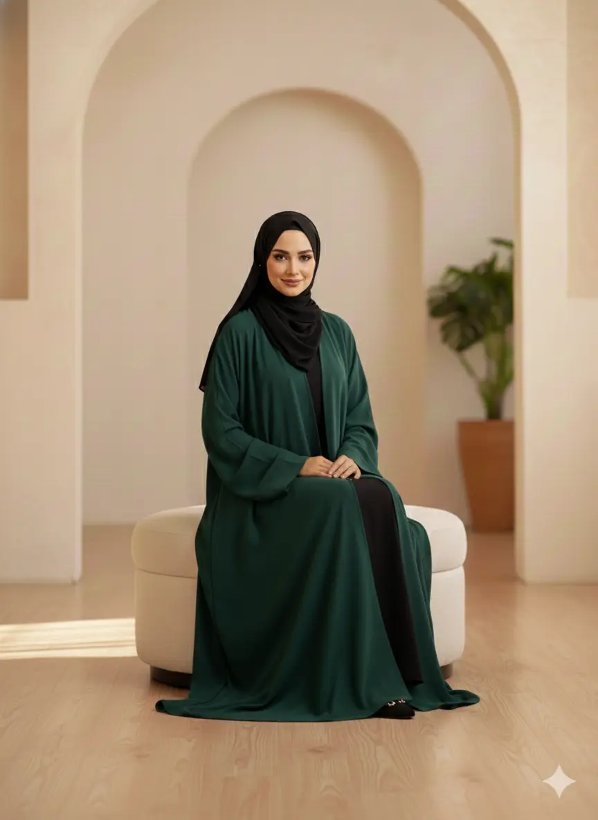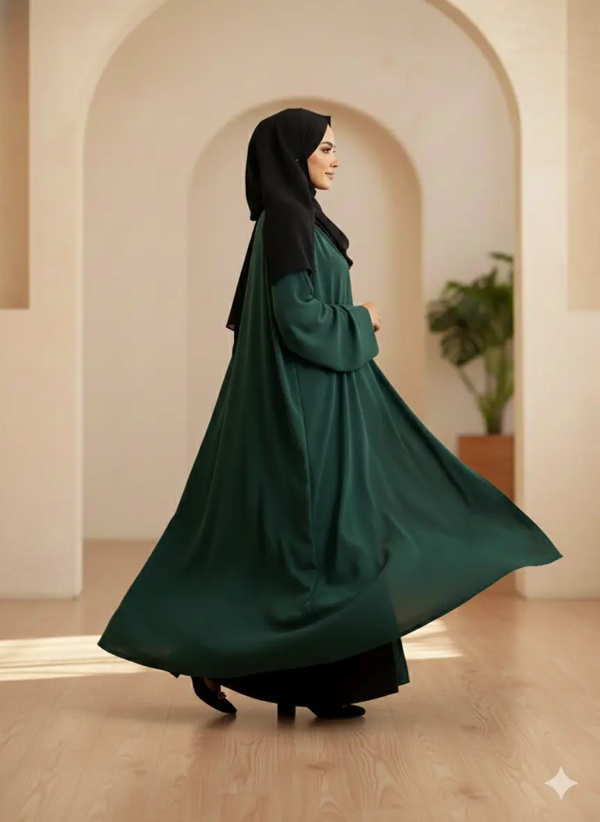 The upper is crafted from premium nida fabric, known for its soft texture, lightweight feel, and beautiful drape. The rich dark green shade adds a refined charm, while the minimal design ensures effortless elegance. The abaya falls smoothly, providing comfort and ease of movement throughout the day.