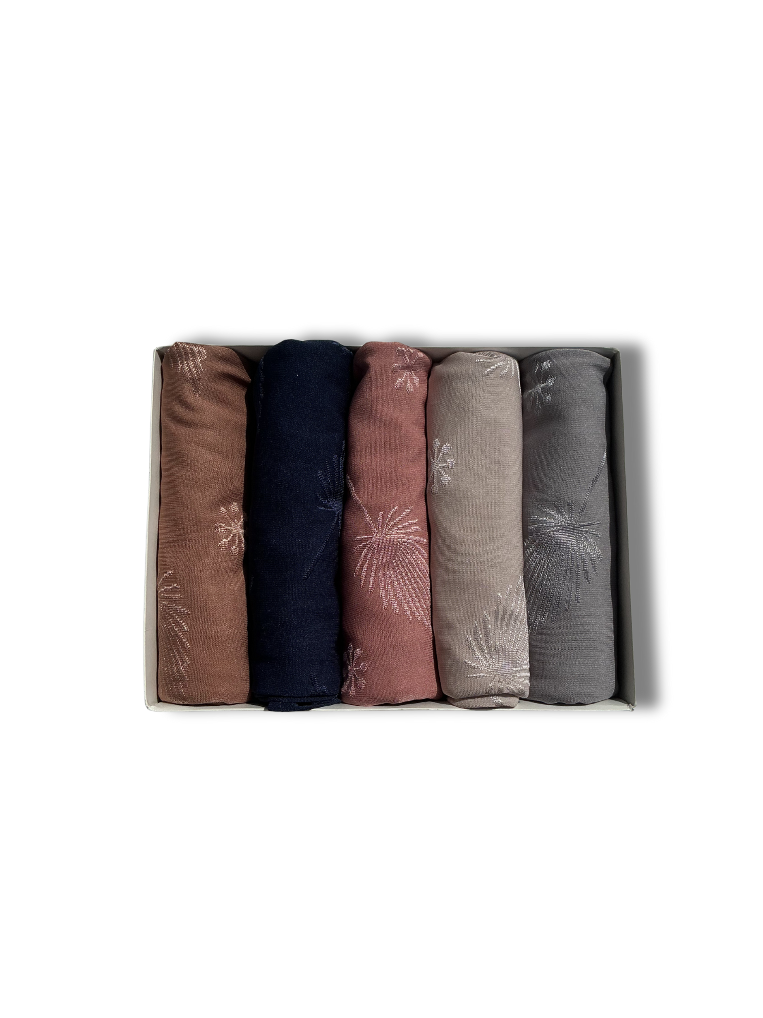 Elegant embroidered jersey hijabs crafted from soft, stretchable fabric for all-day comfort. Each hijab features delicate threadwork detailing, adding a subtle touch of sophistication to your everyday or festive looks.