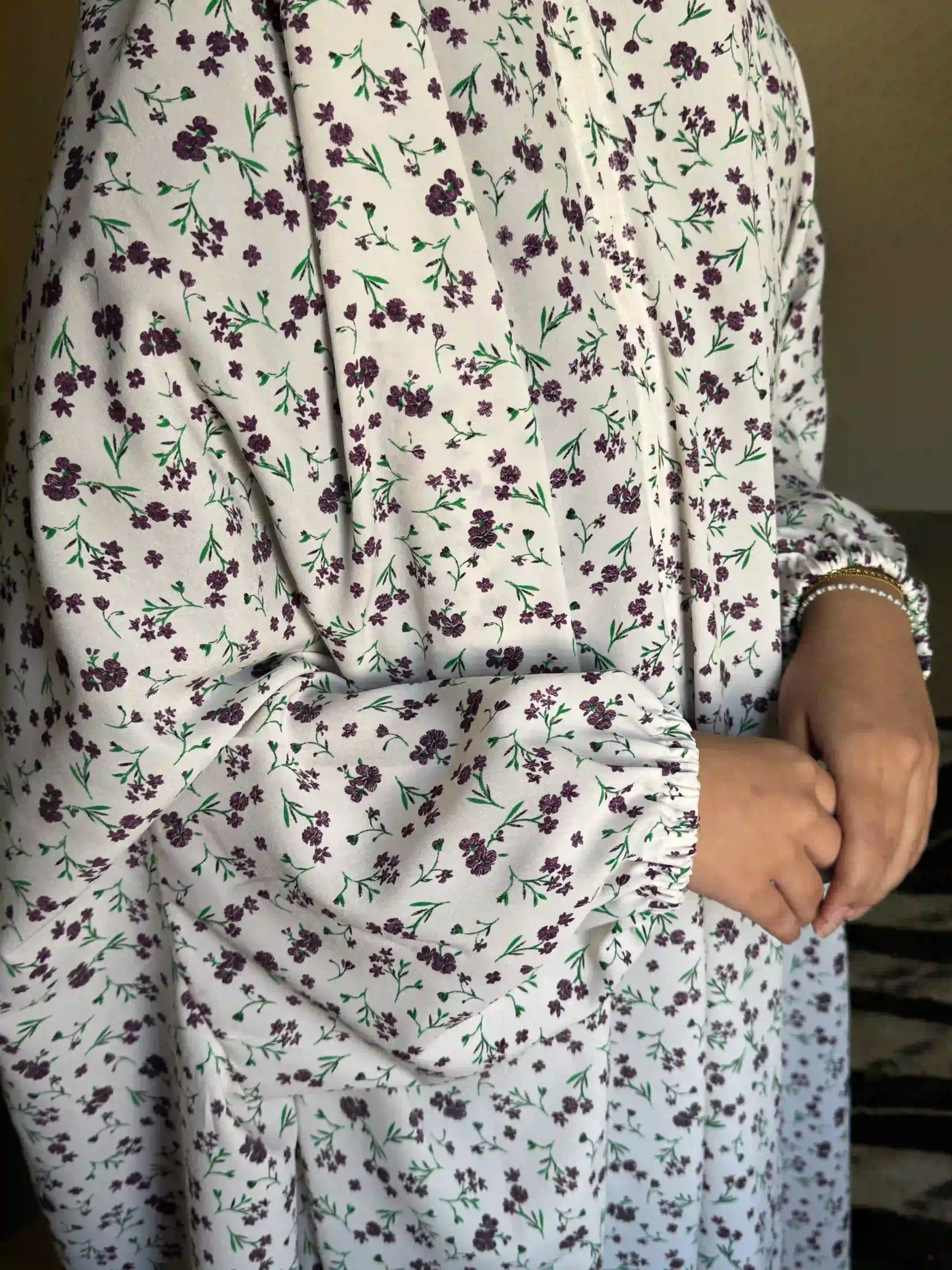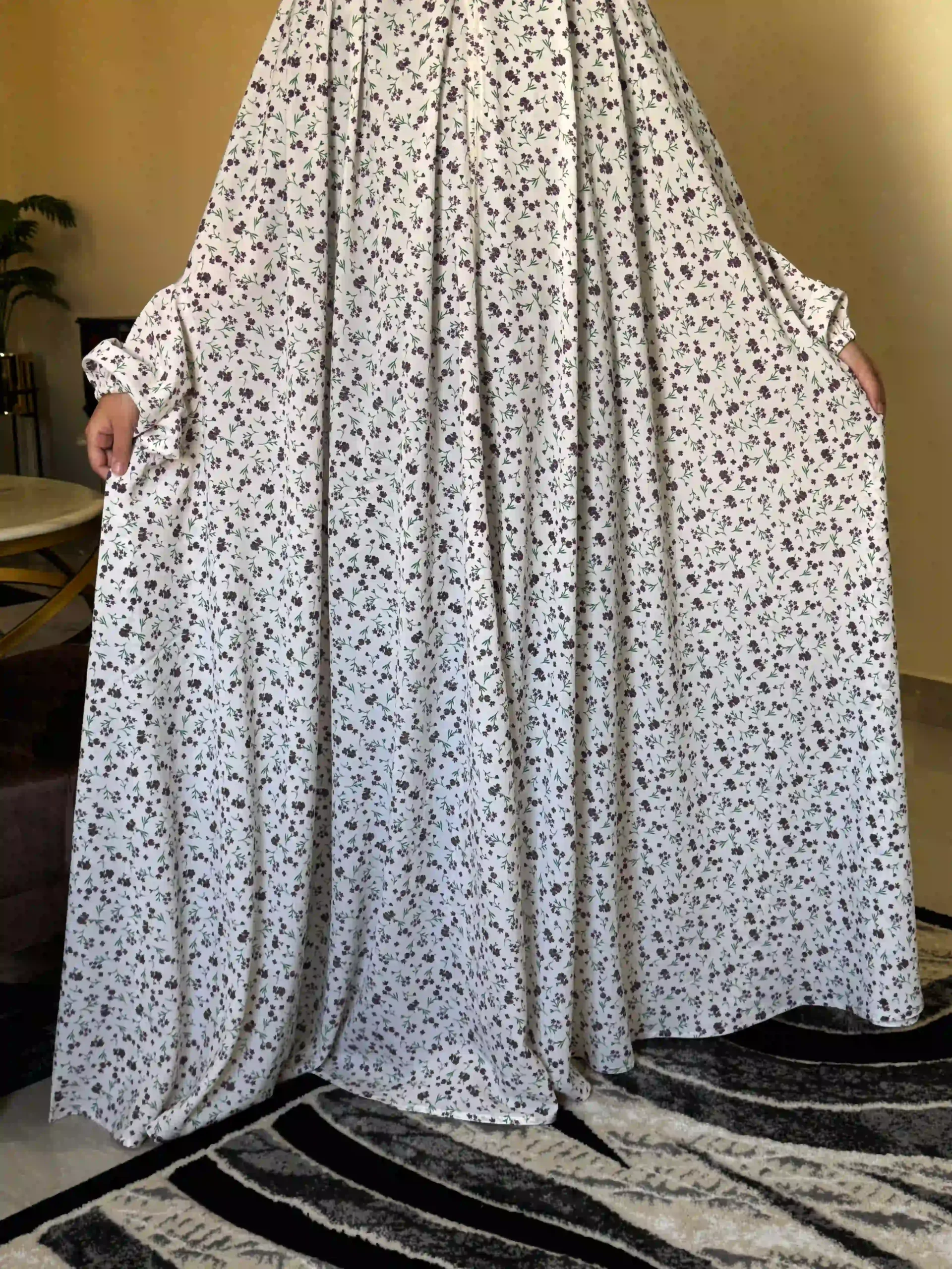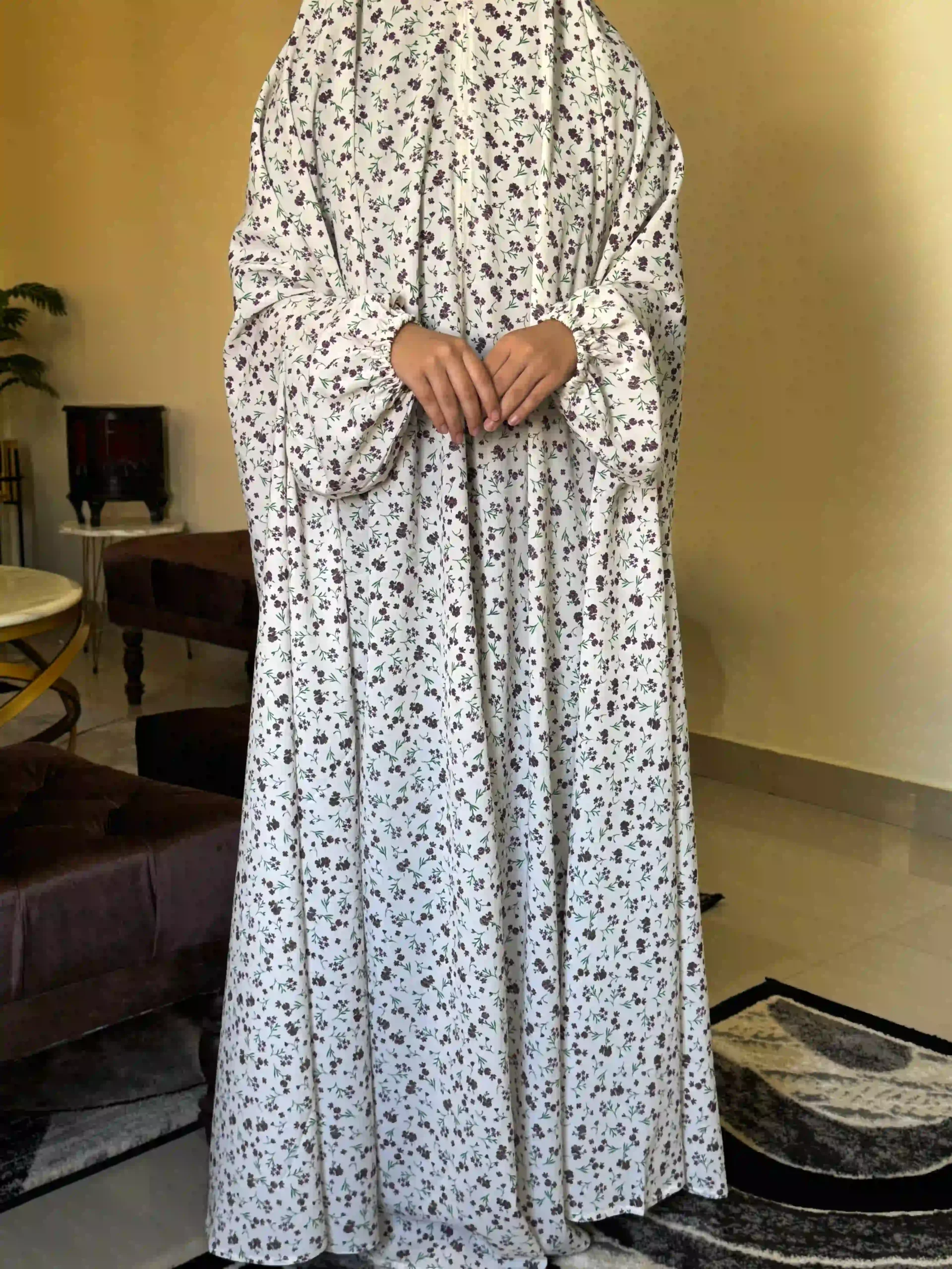 The delicate floral print adds a graceful and feminine touch while maintaining a simple and modest look. Its loose-fitting design provides full coverage and allows easy movement during salah.