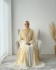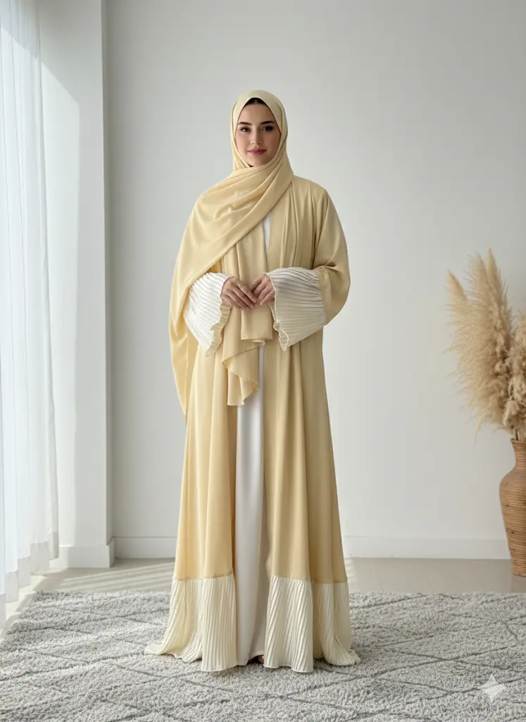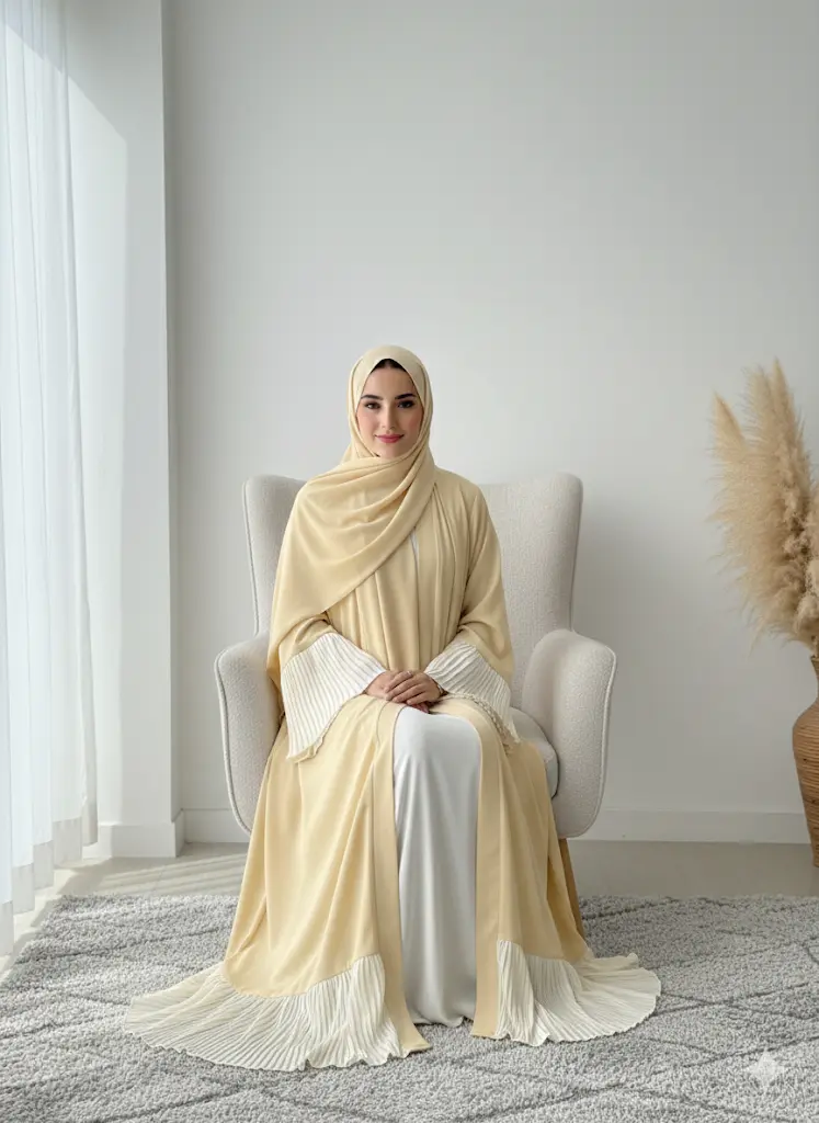 The abaya features pleated detailing on the sleeves and lower hem, adding a soft feminine touch to its timeless look. Its warm cream tone enhances your natural grace, while the option to pair it with a matching scarf creates a perfectly coordinated outfit.