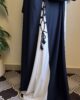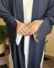 This stylish navy blue abaya is crafted from Nida fabric and comes with a white sleeveless inner and matching scarf. It offers a modern yet modest look perfect for any occasion.