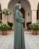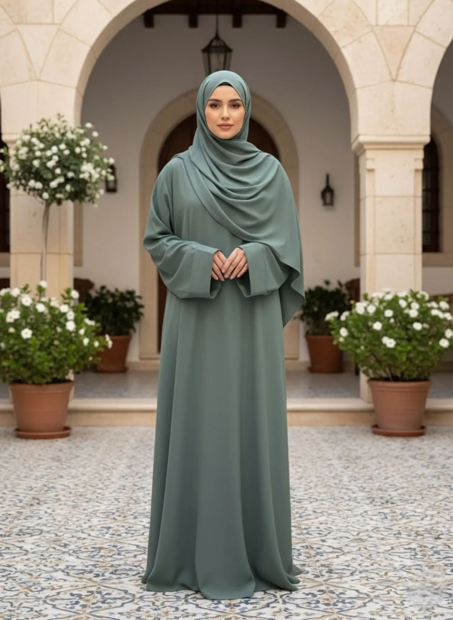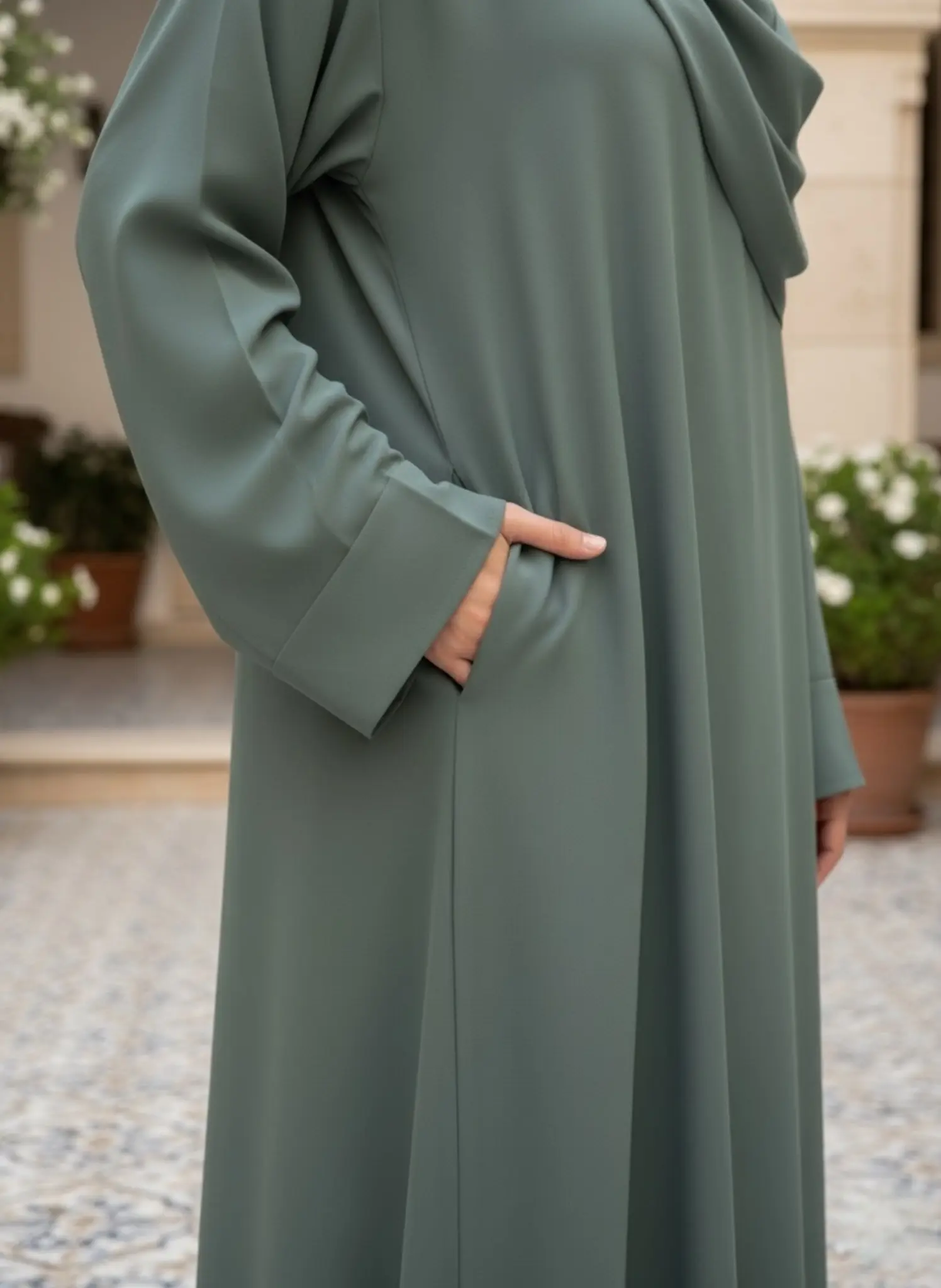 This elegant front-close Abaya is designed with a clean round neck and stylish folded cuff sleeves for a timeless look. Crafted from premium Nida fabric, it offers a soft, lightweight, and breathable feel—ideal for everyday wear and perfectly suitable for your Umrah and travel needs.