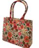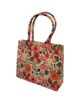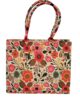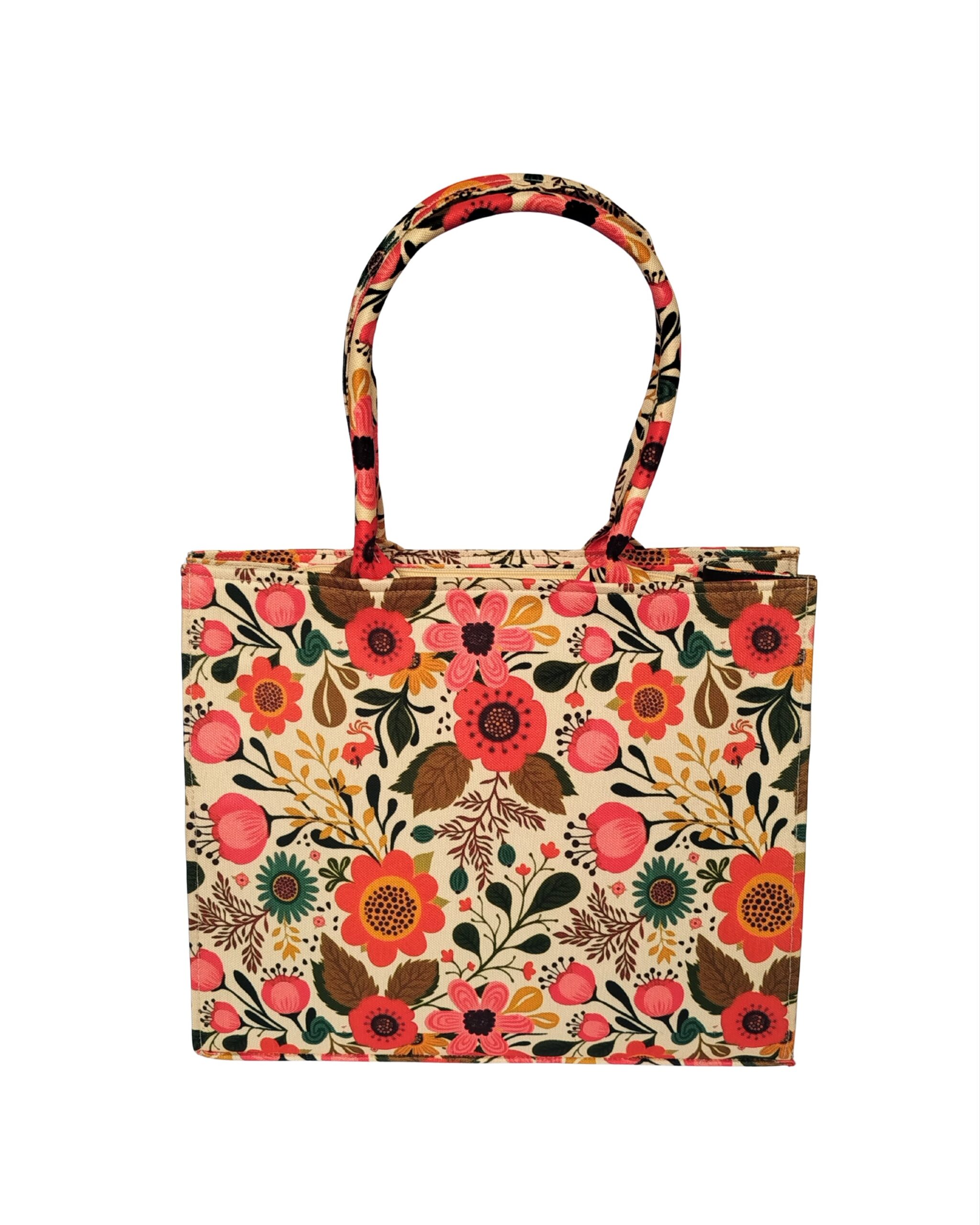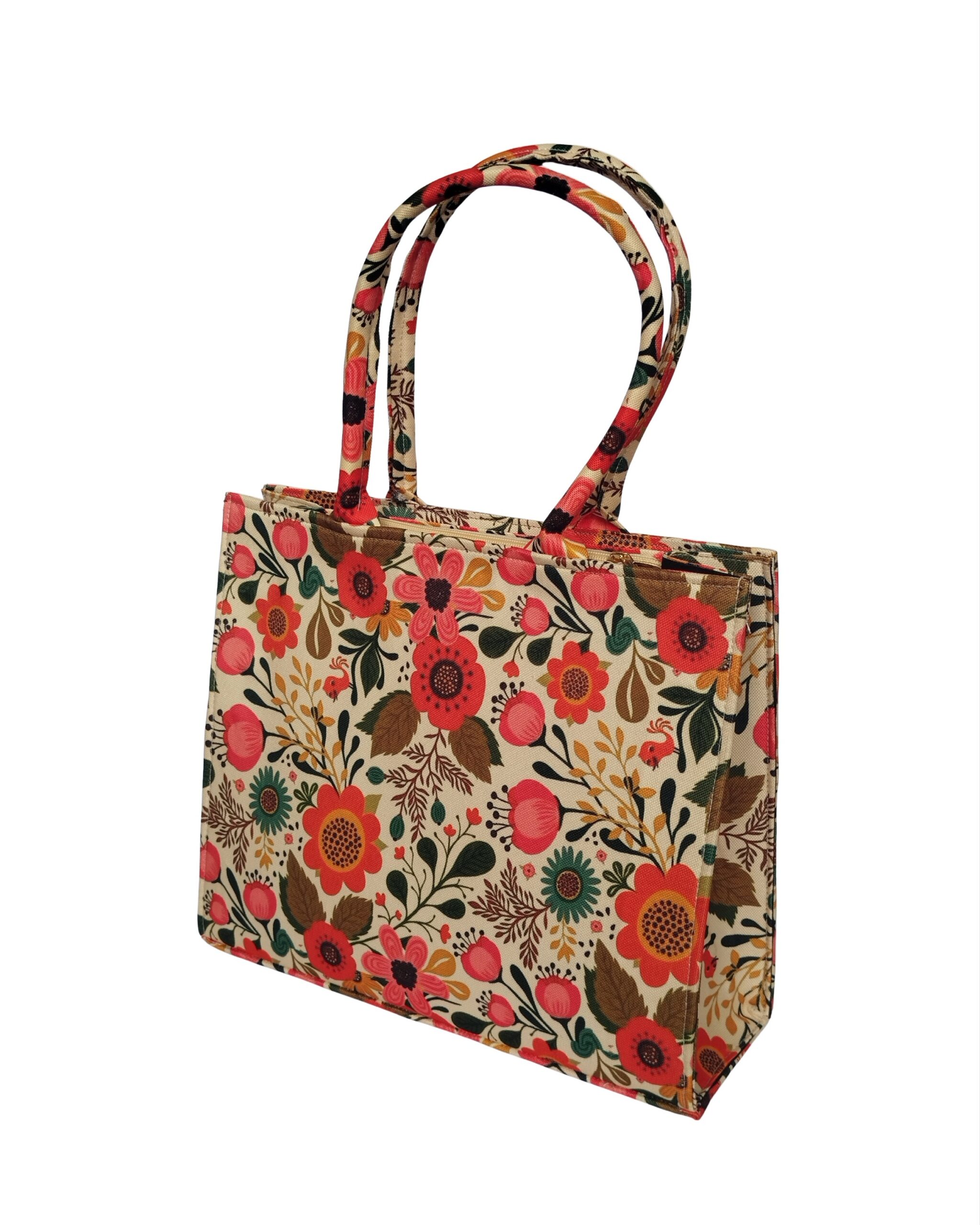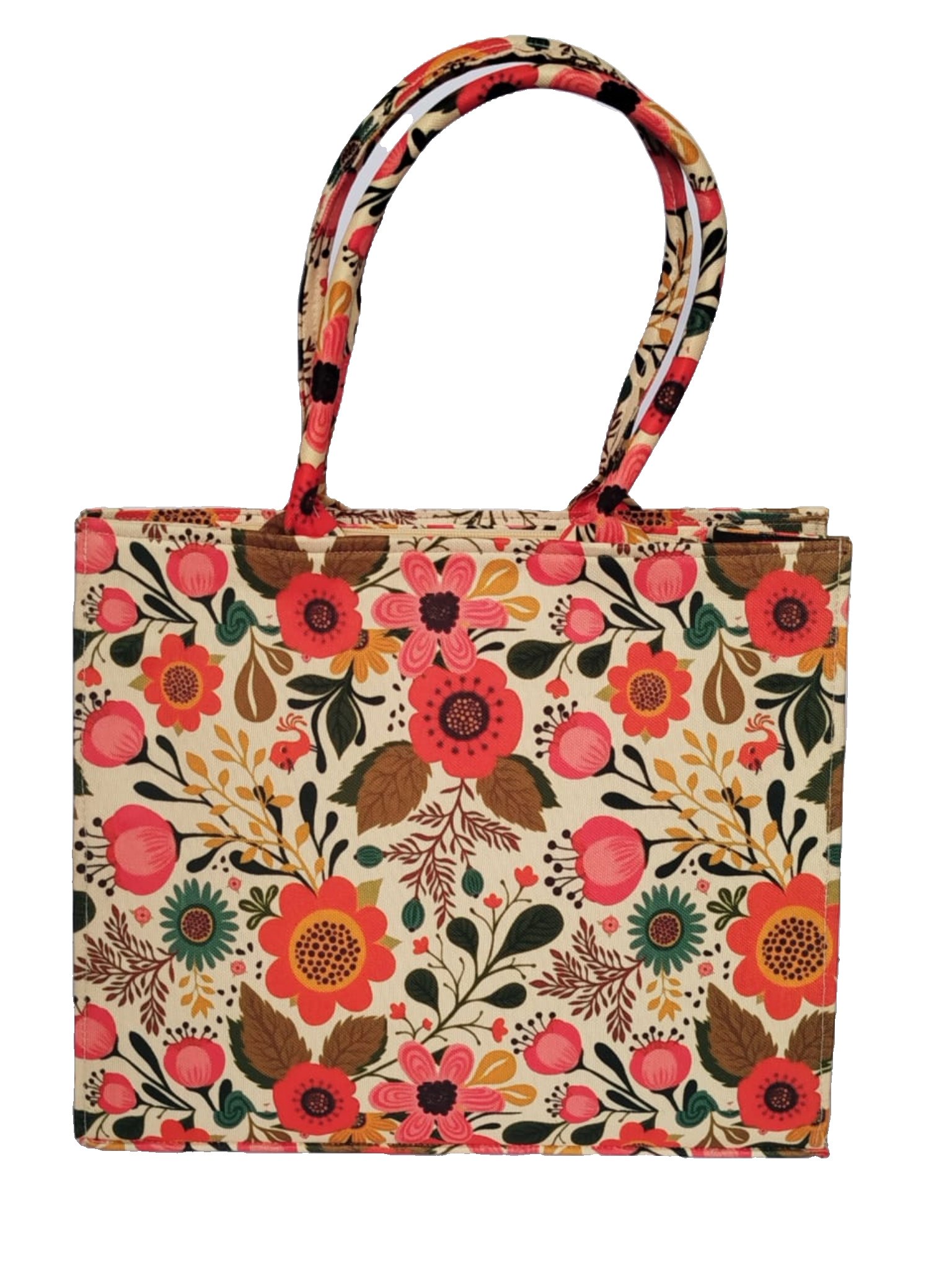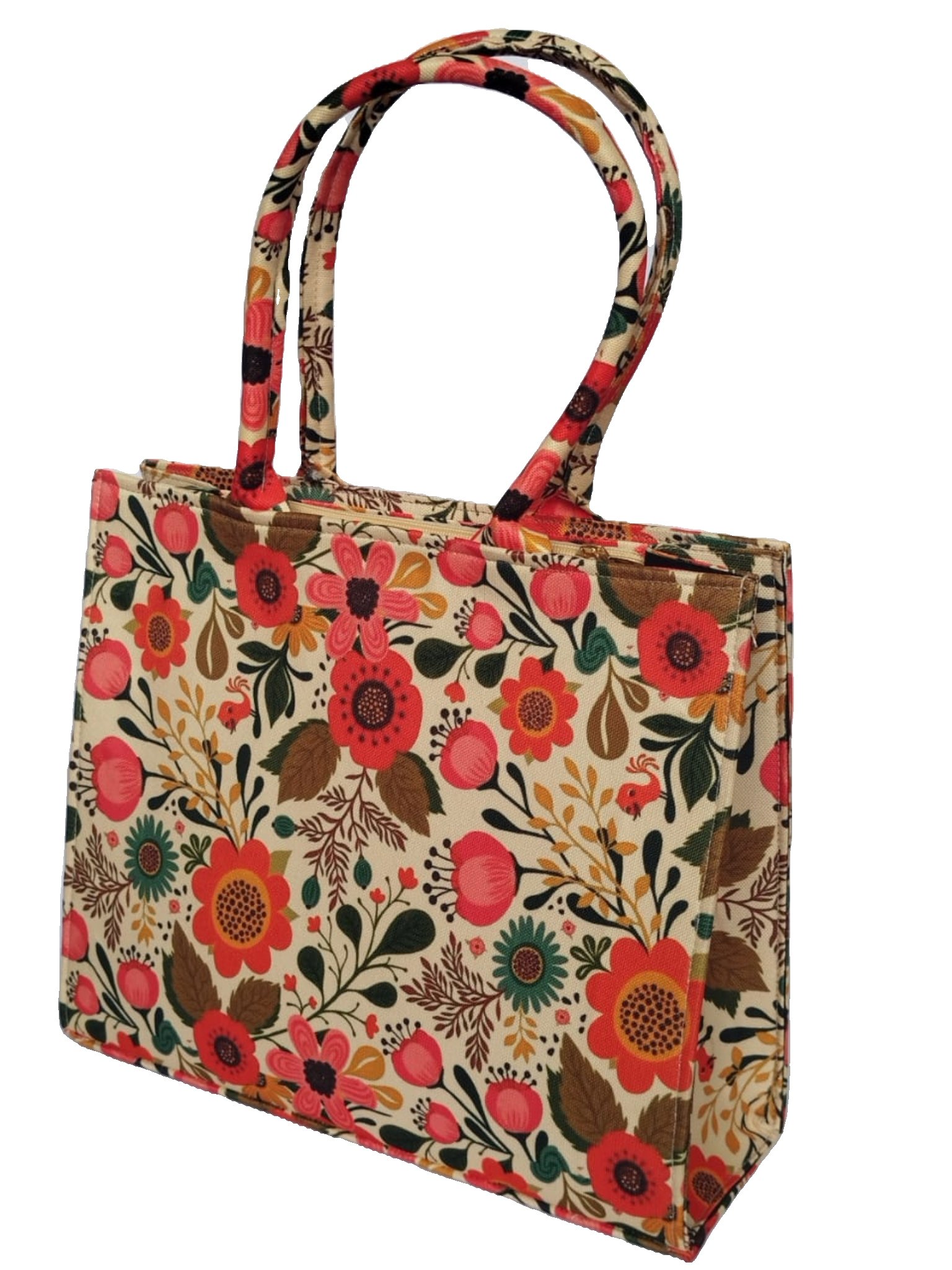 - Pattern: Vibrant folk floral design with large red and orange blooms on a natural-colored background.