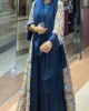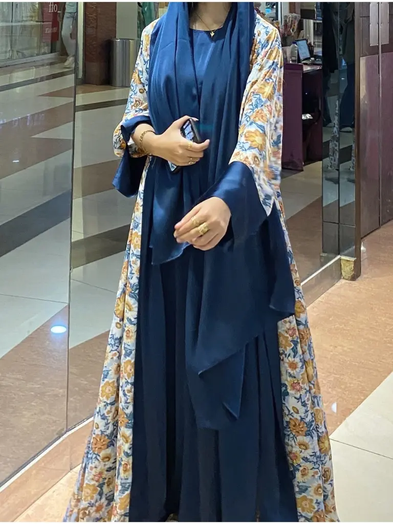 Embrace rich color and luxury with our Midnight Floral Abaya Set. This elegant three-piece ensemble features a flowing zinc blue inner dress and a complementary outer abaya with stunning floral-printed sleeves and trim. Finished with a matching scarf, this look is perfect for making an unforgettable statement at any grand occasion.
