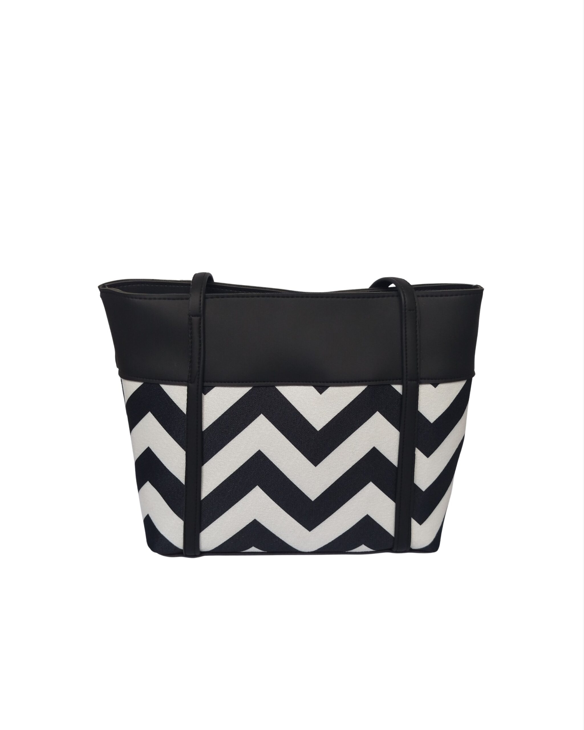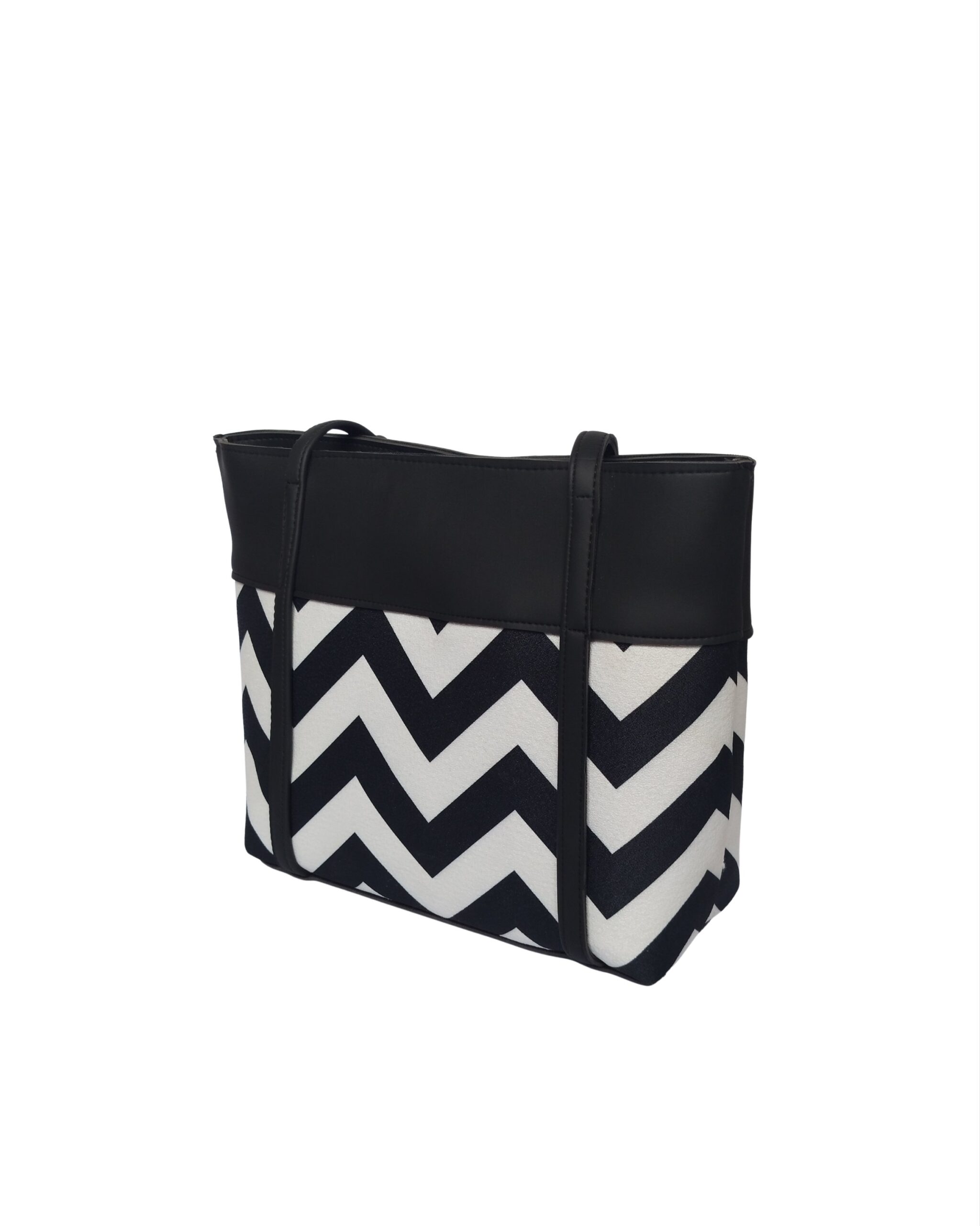 Make a bold statement with this stylish Chevron Tote. The classic black and white colors meet a modern, graphic zig-zag pattern, creating a bag that is both eye-catching and versatile. Perfect for adding a contemporary touch to any outfit.