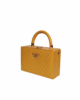 Add a pop of color to your look with this structured box clutch. The vibrant mustard yellow tone and elegant chevron stitching, accented with a gold-tone top handle, make it a versatile piece perfect for a night out or a refined daytime look.