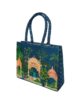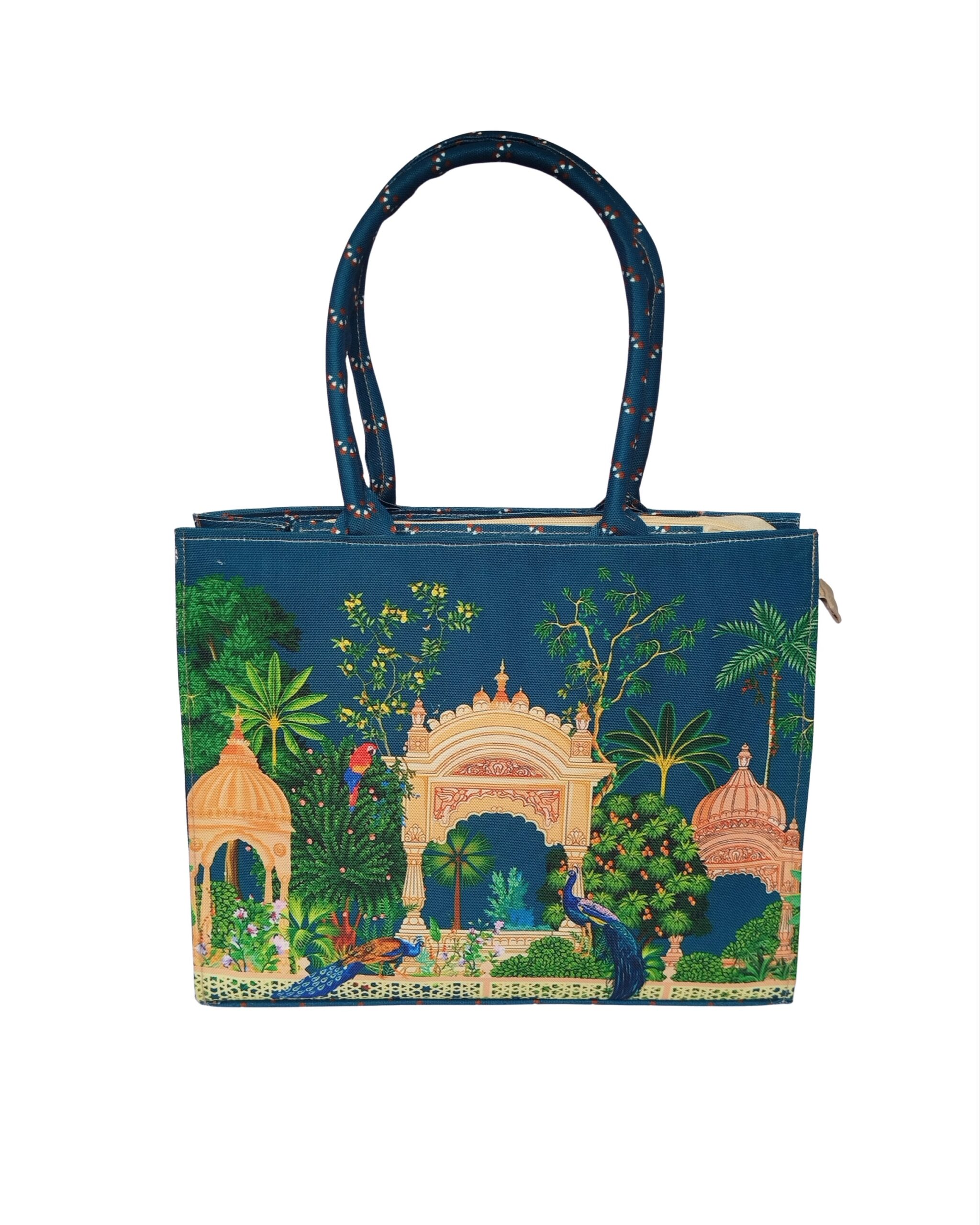 Carry a piece of art with you. This beautiful peacock garden canvas bag features an intricate print on a stunning teal background. The detailed scene of peacocks and a traditional palace creates a sophisticated and timeless look, making this bag perfect for adding an elegant touch to your daily routine.