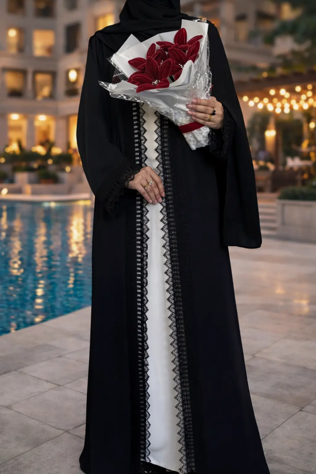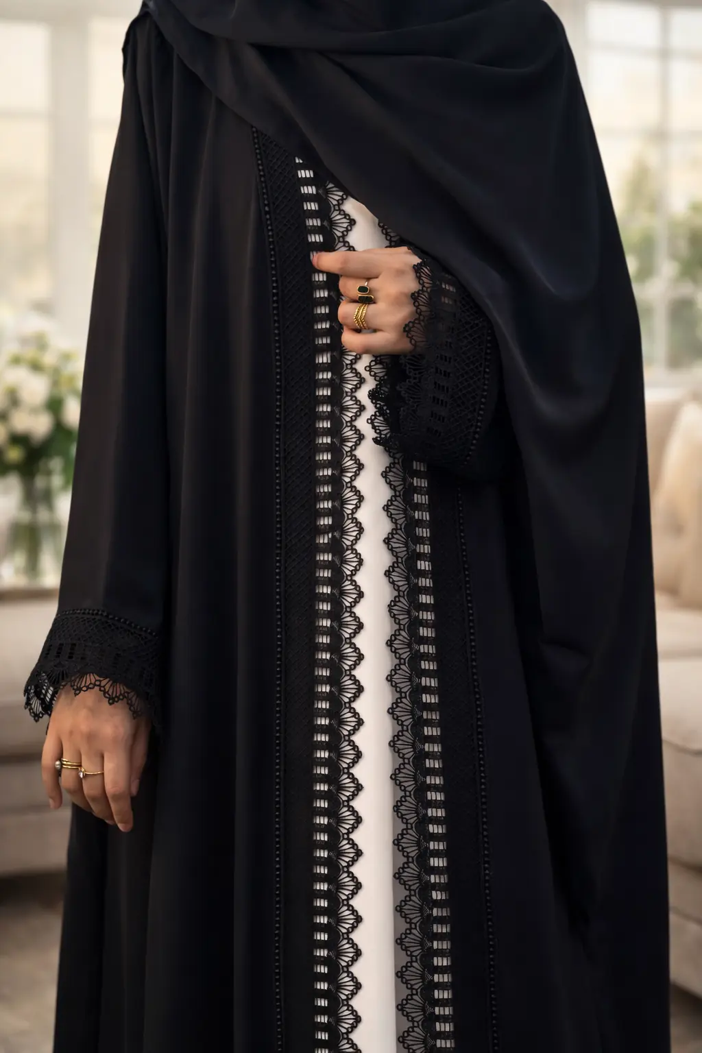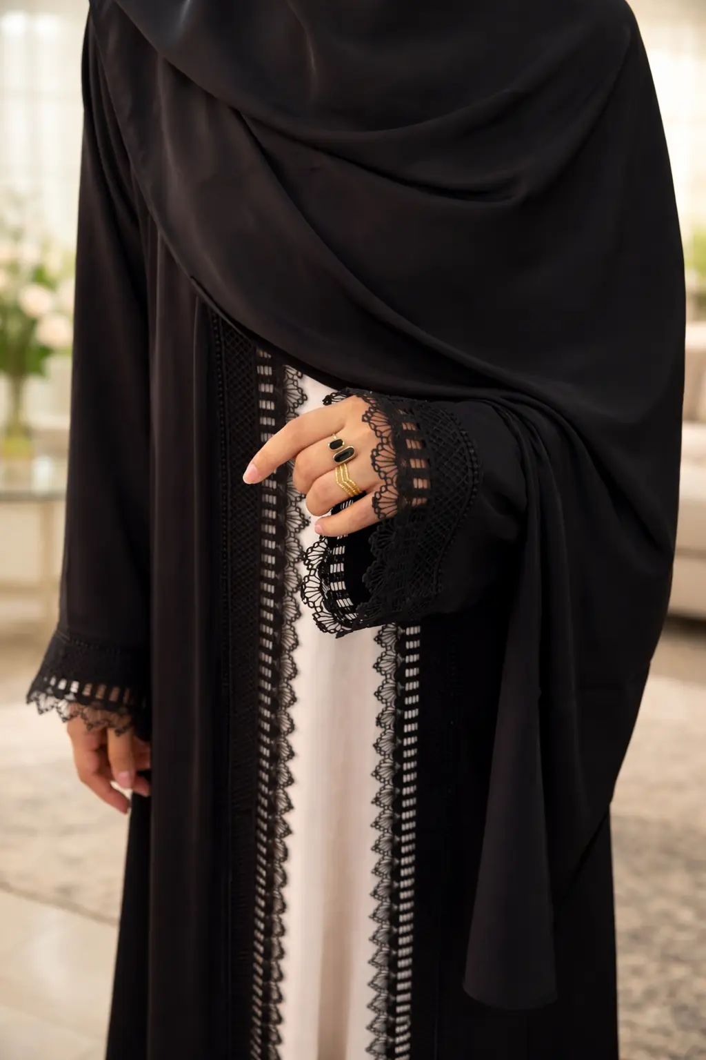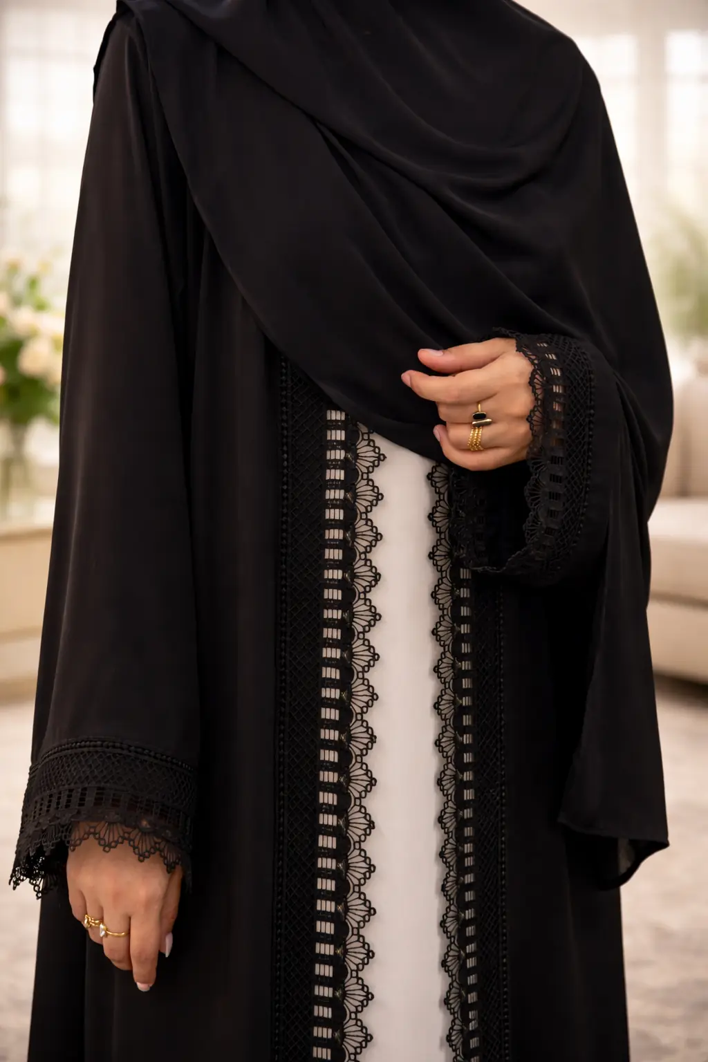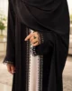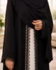 Timeless Elegance in Black & Cream Upgrade your formal wardrobe with our 3-Piece Black Lace Abaya Set. Made from premium, breathable Nida fabric, this set features a striking contrast between a sleeveless cream inner and a jet-black upper adorned with intricate floral lace. Whether it’s an evening event or a special gathering, this flowy and sophisticated ensemble ensures you stand out with grace.